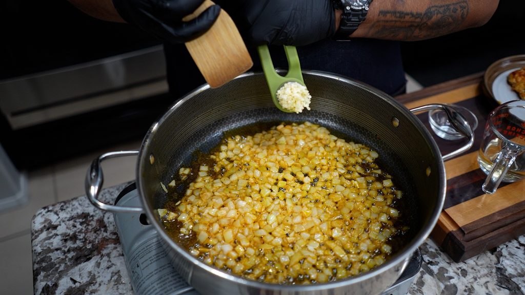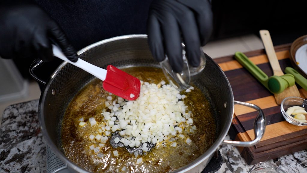 - In the same pan, add butter and sauté onion and garlic until onion becomes transparent (about 2 minutes). Pour in white wine and simmer for 5 minutes, or until beginning to reduce down.