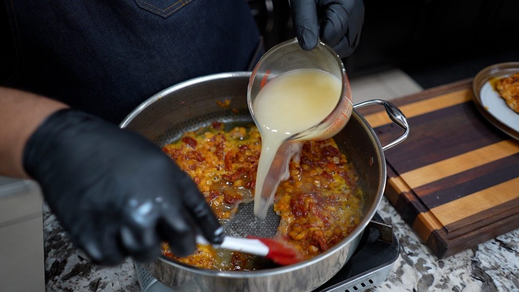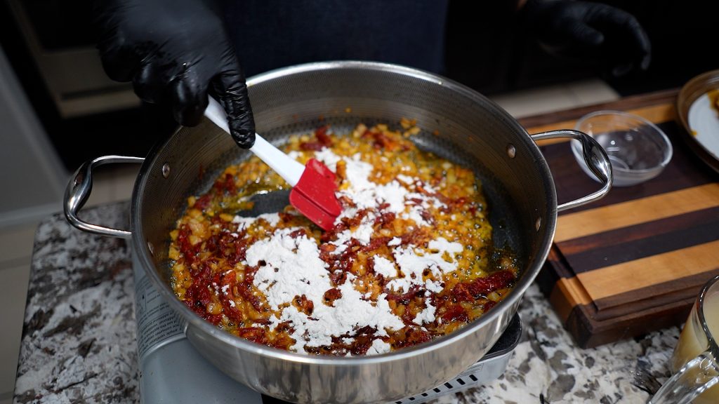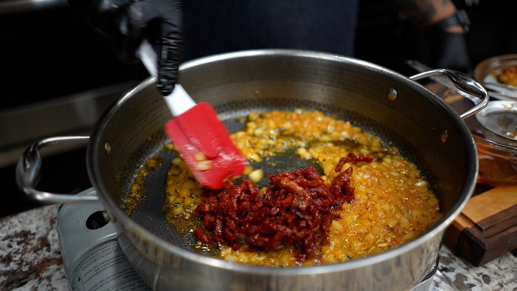 - Add sun-dried tomatoes with 2 tablespoons of reserved oil from the jar and cook for 1-2 minutes to release flavor.