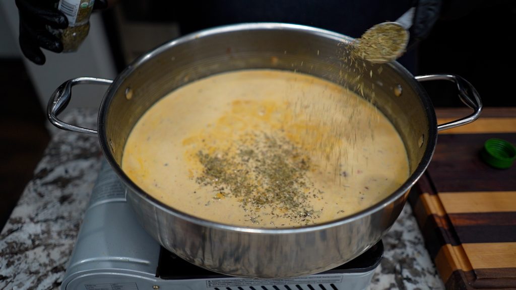- Stir flour into the pot and cook for a further minute. Then, add broth, 2 1/2 cups of half and half (or milk), herbs, salt, and pepper, and bring to a low simmer.