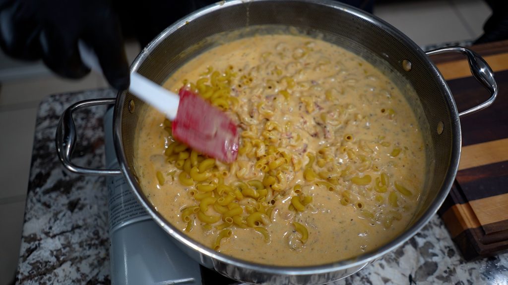 - Add dry macaroni and stir occasionally as it comes to a simmer. Reduce heat to medium-low and stir regularly while it cooks (for about 9 – 10 minutes), or until sauce thickens and macaroni is just cooked (al dente).