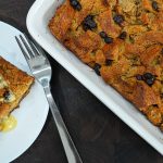 Spoon the bread mixture into the prepared baking dish, ensuring even distribution of raisins.