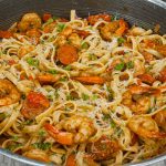Toss cooked pasta and sausage into the sauce. Heat for 2–3 minutes. Add shrimp, stir well, and remove from heat.