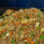 Combine the scrambled egg, rice, salt and pepper. Cook for a few minutes and continue using the spatula to combine all the ingredients. Add the chicken and shrimp pieces to the rice mixture.