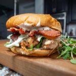 Spread ranch dressing on both sides of the bread. Layer the chopped chicken over the bottom half, then add the crispy bacon, lettuce, tomato slices, and red onion if using. Make sure the toppings are evenly distributed so every bite has good balance.
