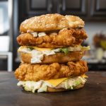 Place the middle bun on top, add more sauce, lettuce, pickles, and cheese, then add a second chicken fillet. Finish with the top bun and serve immediately.