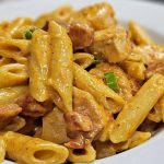 Return the cooked chicken and seared andouille sausage to the skillet. Stir to coat the chicken and sausage with the creamy tomato sauce. If the sauce is too thick, you can add a bit of the reserved pasta water to achieve your desired consistency.