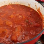 Add tomatoes & simmer then add canned tomatoes, tomato paste, red pepper flakes, salt, and black pepper. Simmer on LOW heat for 3 or more hours – stir every so often.