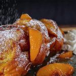 Place the cooked French toast on a serving plate. Spoon the caramelized peach mixture over the French toast. Add a dollop of whipped cream on top. Dust with powdered sugar for extra sweetness.