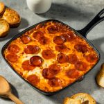 Once the pizza dip is bubbly and golden, remove it from the oven.