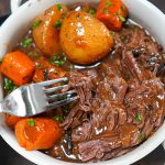 Cut potatoes and peel/slice carrots. Arrange around the roast in the slow cooker.