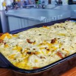 In a bowl, whisk together eggs, milk, salt, and pepper. Pour the egg mixture over the layered ingredients in the baking dish.