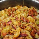 While the cabbage is cooking, crumble the beef bacon you cooked earlier. Once the cabbage has reached your desired texture, remove the pan from heat, and stir in the crumbled beef bacon.